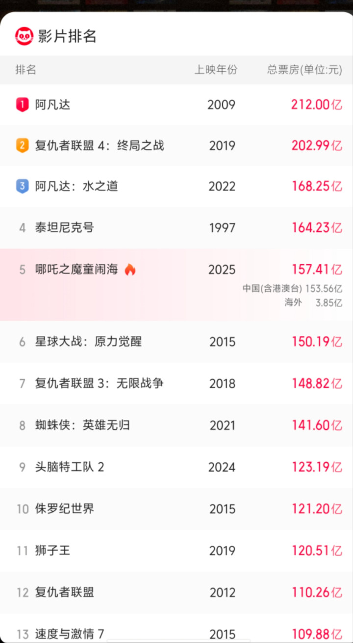 看看票房数字更有意思。157亿这个成绩,相当于把6部《流浪地球》摞起来那么高。现在它正以每天近3000万的速度逼近《阿凡达:水之道》的168亿纪录,照这个势头,说不定等您刷完这条朋友圈,小哪吒又往前蹿了几名。要知道,全球票房前十向来是《复仇者联盟》《星球大战》这样的好莱坞巨无霸的天下,《哪吒2》要是真能挤进前三,那可就是亚洲电影破天荒头一遭。
